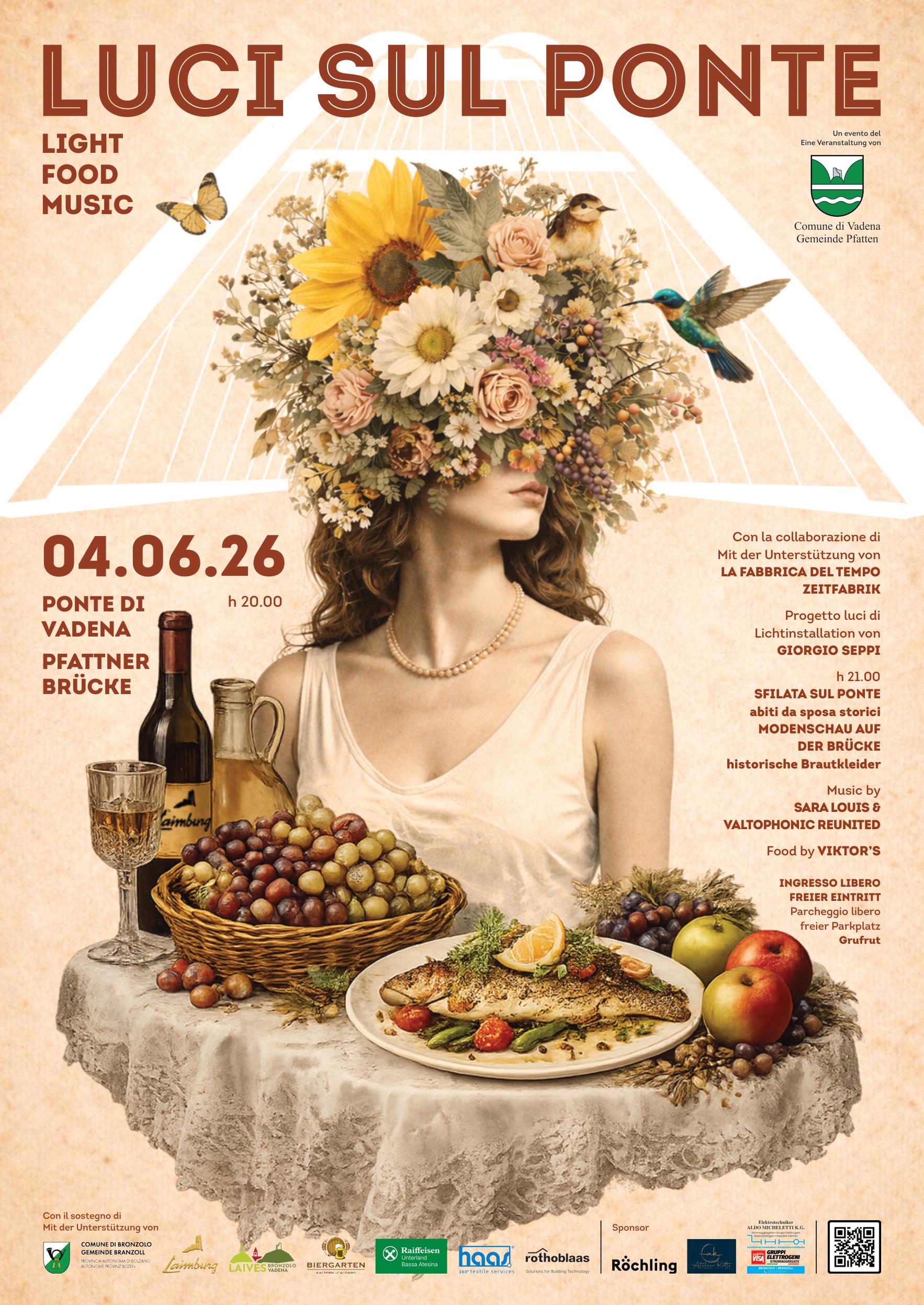 Creating the right atmosphere will be the light installation by artist Giorgio Seppi, who knows how to emphasise the lights on the bridge. The territory and the proximity to the water are also reflected in the culinary accompaniment of the evening: fish and old traditional dishes will be served, accompanied by wines from the Laimburg Winery.